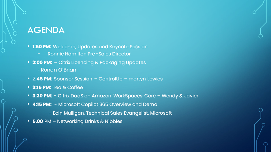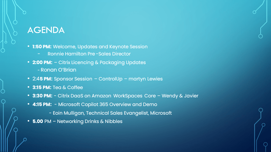 As the agenda was finalised, a last-minute adjustment was required. Fortunately, Ronan O’Brien was available to deliver a timely session on Citrix licensing changes, filling in for a presenter unable to travel.